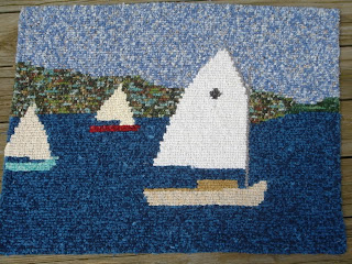 Four years ago I made a locker hook rug for my husband for Christmas. Locker Hook rugs are made using fabric strips, cotton string, and rug canvas using a special tool that looks like a crochet hook with a large needle eye. It's an original design with my husband's sailboat as the center and the shoreline of Lake Murray as seen from our lake house. My second rug was the state of SC. Then I taught my sister to make them. She's made at least 20 rugs, teaches classes, and sells them. She even gave me one as a present.